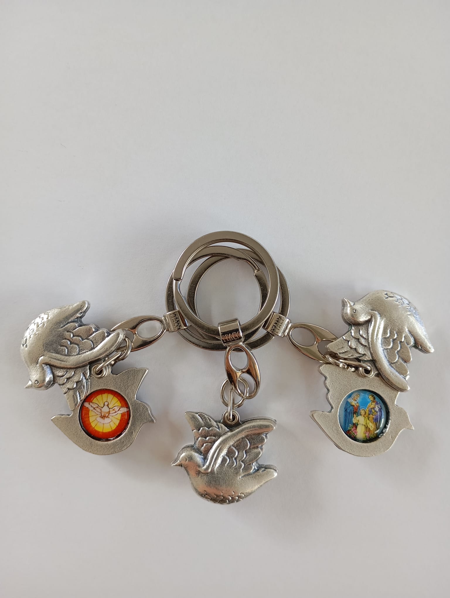 Llavero plateado del Espíritu Santo doble cara por dentro con imagen del Espíritu Santo y imagen de la sagrada familia.