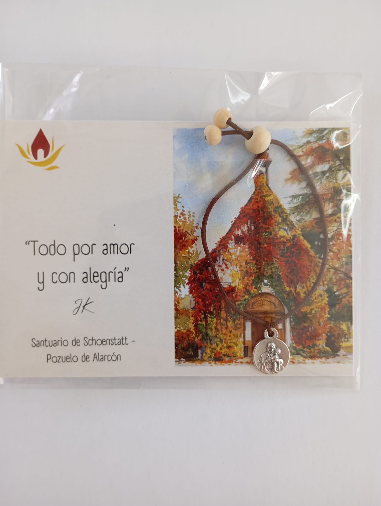 Pulsera elástica marrón con la medalla de la Mater redonda.
